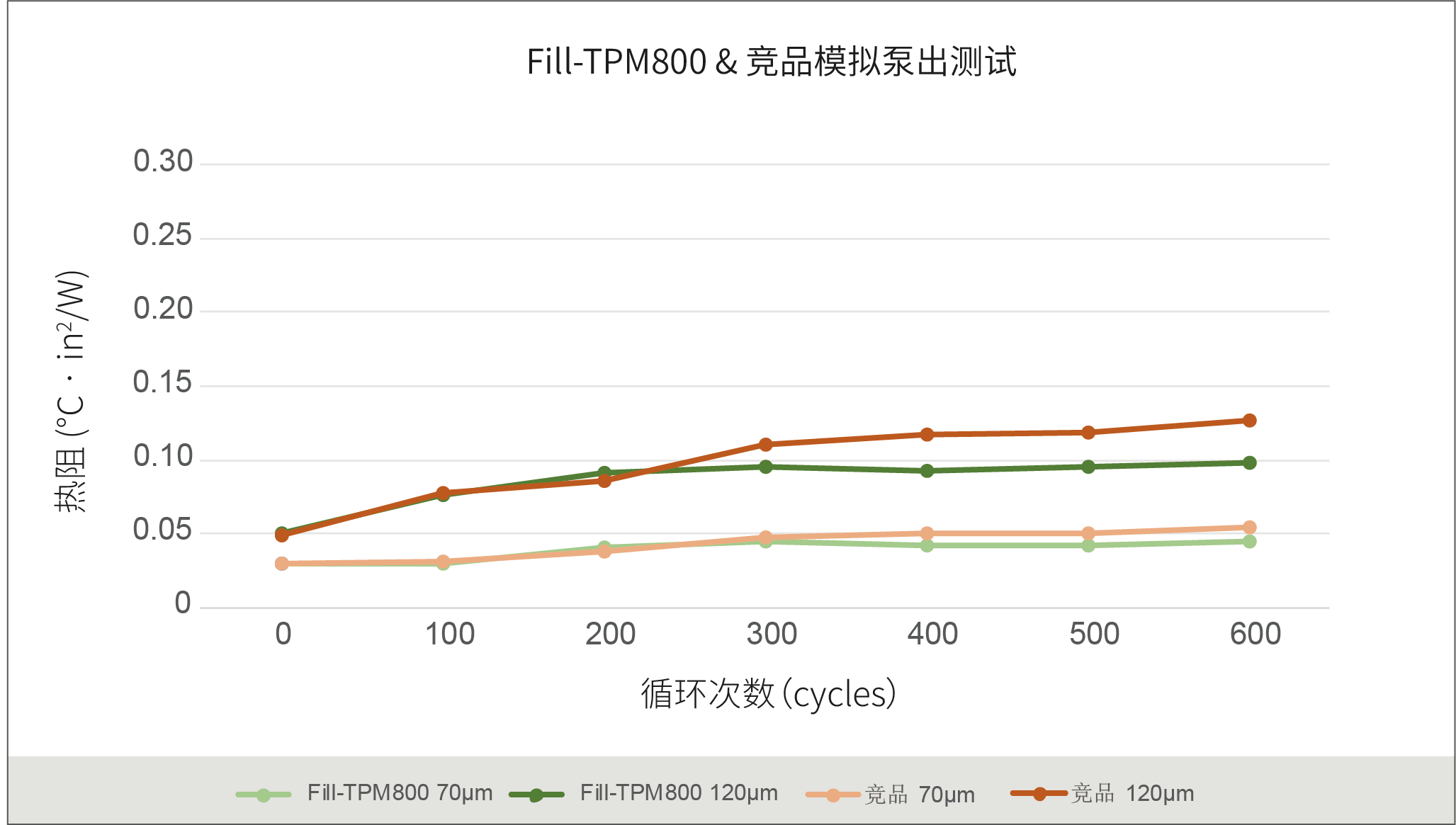 Ff-tpm 800 has a higher cohesion and demonstrates stable and excellent anti-pumping capability in vibration cycles within the 70-120μm range, nearly stably controlling thermal resistance. This stable thermal resistance control is particularly important for demanding application scenarios like intelligent driving domain control.